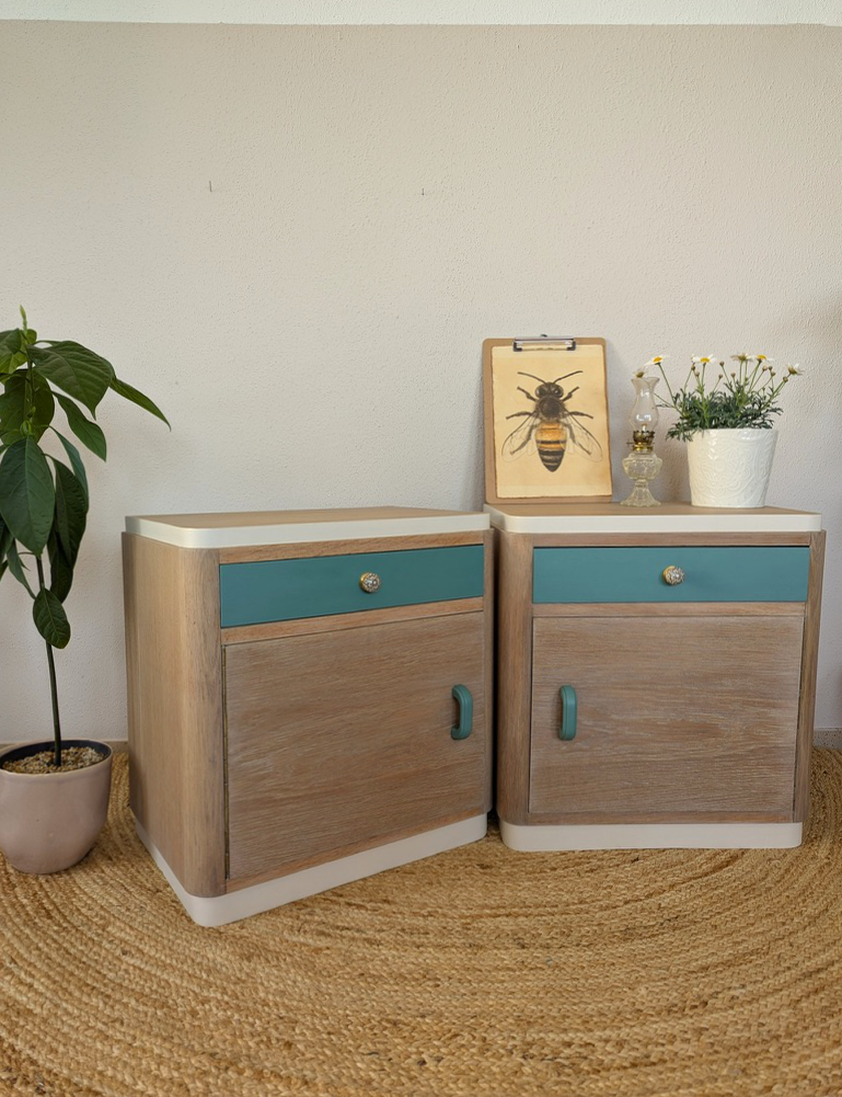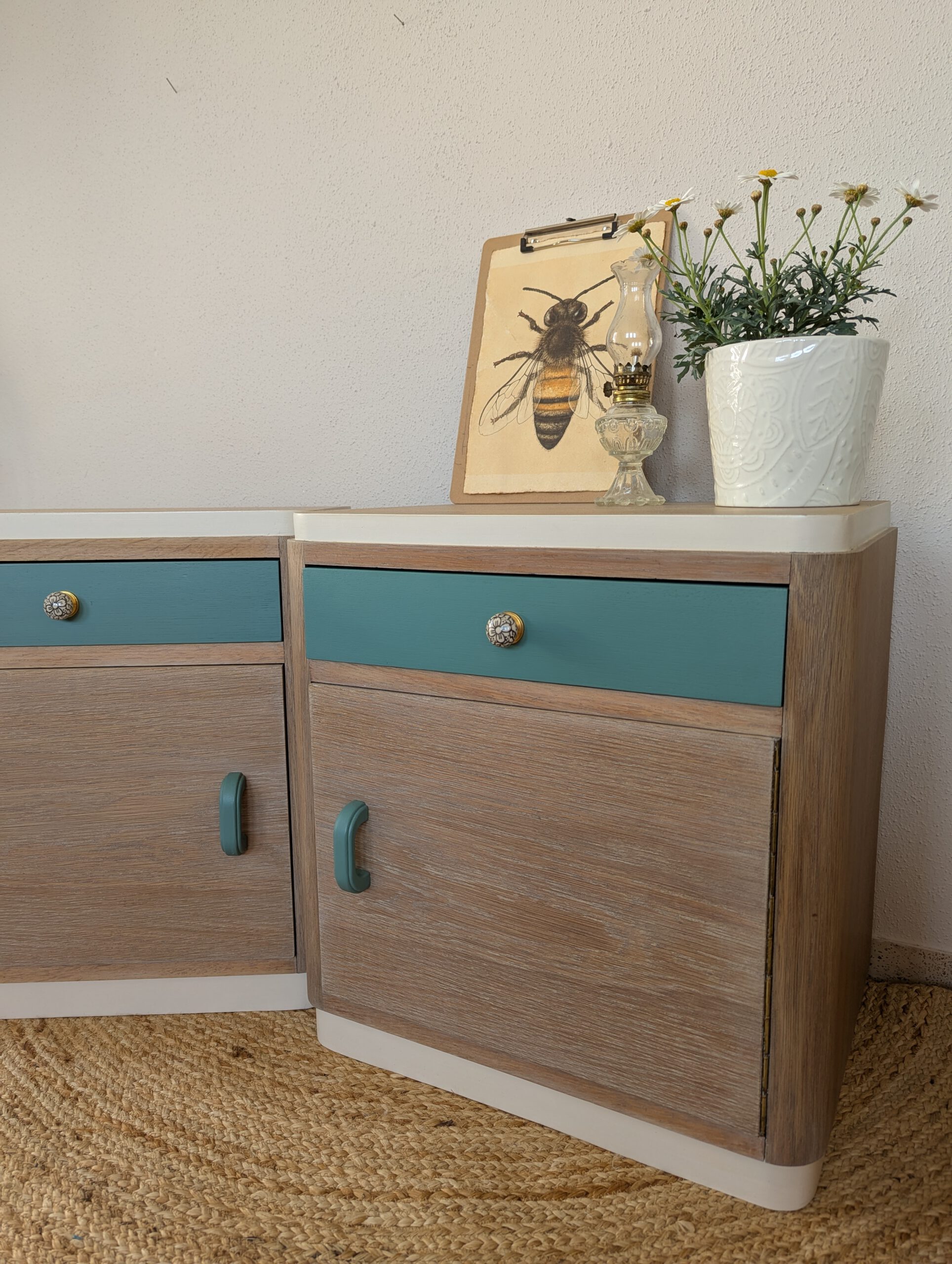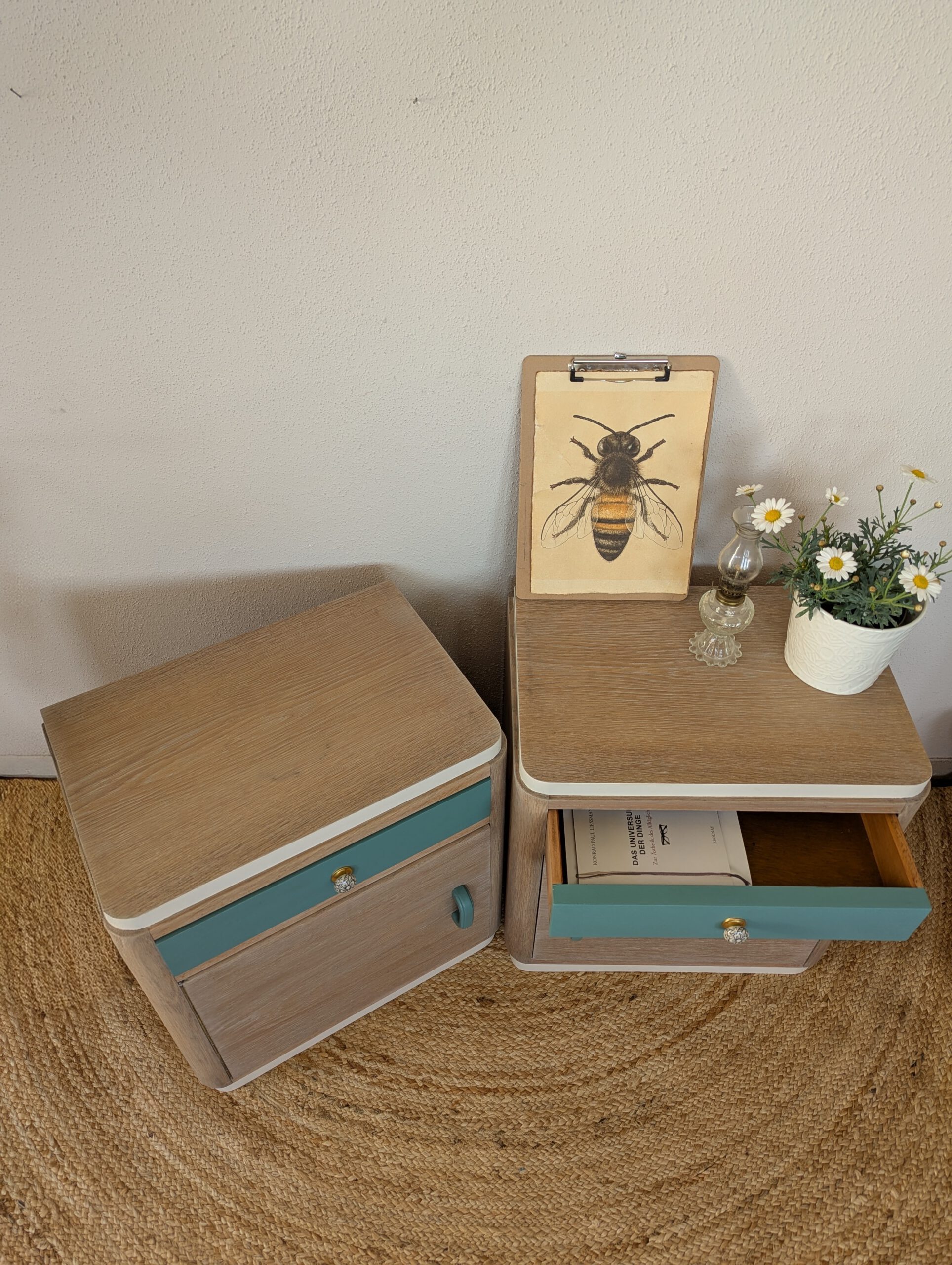 Bei diesen zwei Bettkischdle dienten die Margeriten als Inspiration für die neu Gestaltung. Das Holz wurde abschliffen und in einem Cremeton geölt um die natürliche Maserung hervorzuheben heben. Die grün gestrichenen Schubladen erinnern an das grün der Margeriten. Die Schubladen haben zwei neue, florale Möbelgriffe bekommen, an den Türen wurden die, noch intakten, alten Griffe verwendet. Getreu dem Motto „Nutze was da ist“. Das innere wurde mit einer Möbelpolitur ausgerieben um den muffigen Beigeschmack vergangener Jahrzehnte zu verbannen.