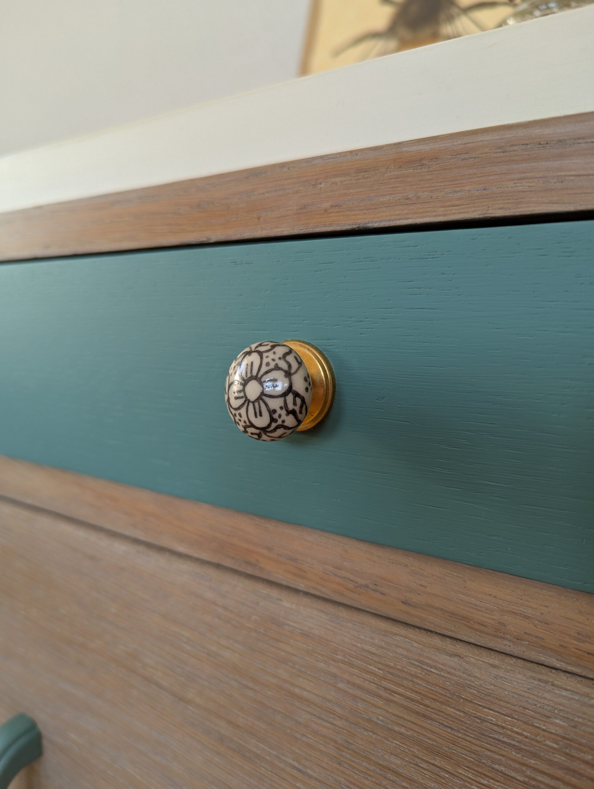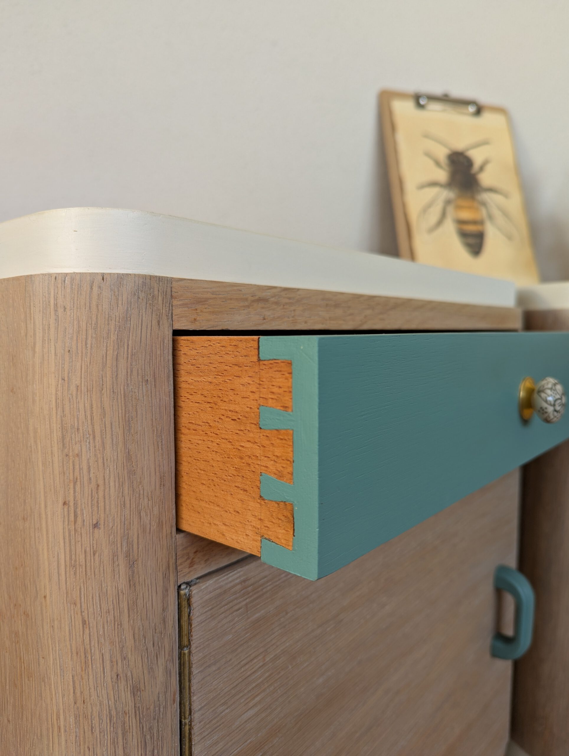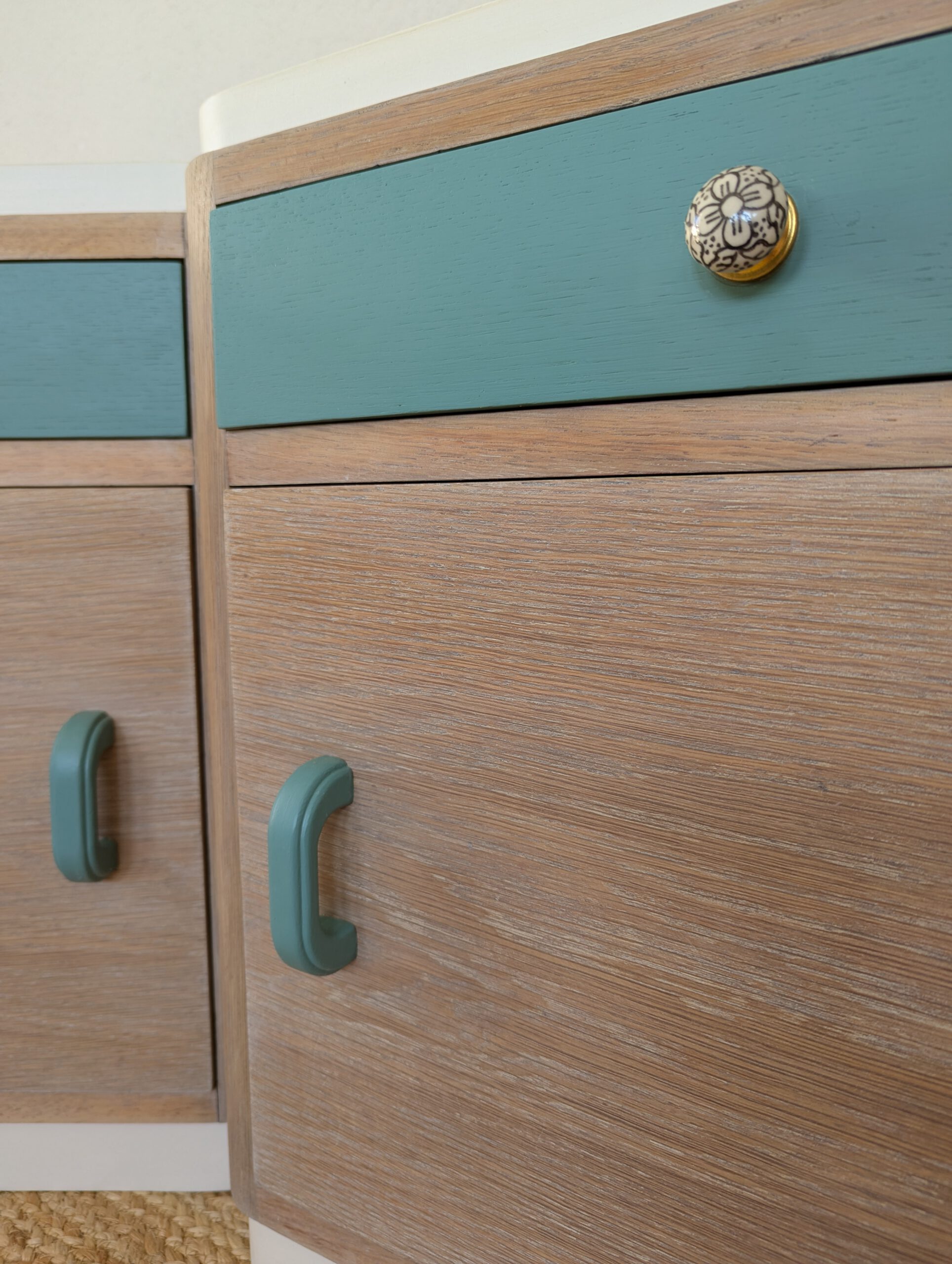 Bei diesen zwei Bettkischdle dienten die Margeriten als Inspiration für die neu Gestaltung. Das Holz wurde abschliffen und in einem Cremeton geölt um die natürliche Maserung hervorzuheben heben. Die grün gestrichenen Schubladen erinnern an das grün der Margeriten. Die Schubladen haben zwei neue, florale Möbelgriffe bekommen, an den Türen wurden die, noch intakten, alten Griffe verwendet. Getreu dem Motto „Nutze was da ist“. Das innere wurde mit einer Möbelpolitur ausgerieben um den muffigen Beigeschmack vergangener Jahrzehnte zu verbannen.