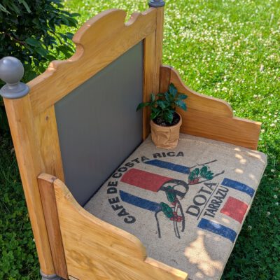 Aus Bett mach Bank Diese einzigartige Bank hat eine besondere Geschichte, sie war ein altes Bettgestell, nun lädt sie zum Verweilen ein. Das Holzgestell wurde abgeschliffen, geölt und mit dezenten Akzenten gestrichen in einem warmen grau/braun, die dem Stück Leben einhauchen. Die Sitzfläche hat ein Polster mit einem Kaffeebohnensack-Bezug mit markanten Aufdrucken bekommen. Die Bank…